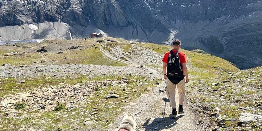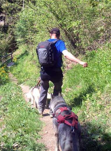 Oben angekommen ist es angenehm kühl und wir und unsere Vierbeiner freuen uns auf eine spannende Wanderung. Es geht schnell recht steil bergauf, aber zum Glück ziehen uns die fleissigen Hunde den Berg hinauf. Trotzdem kommen wir dann doch leicht ins Schwitzen, denn an der Sonne ist es sehr warm. Den Hunden zuliebe und um die wunderschöne Aussicht zu geniessen, machen wir immer wieder kleine Pausen. Plötzlich kommen wir an einem kleinen See vorbei, der mit sehr klarem Wasser gefüllt ist. Jetzt bekommen die Hunde endlich ihre verdiente Abkühlung und sie geniessen dies auch.