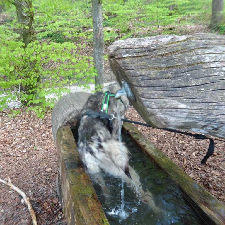 Hier hat es viele Naturstrassen, die durch den Wald führen. Darum ist es hier auch im Sommer sehr schön zum wandern. Auch hat es immer wieder Brunnen am Wegrand, was sehr praktisch ist, wenn man wie wir, mit Hunden unterwegs ist. Natürlich geniessen auch unsere fleissigen Vierbeiner jede erfrischende Abkühlung.