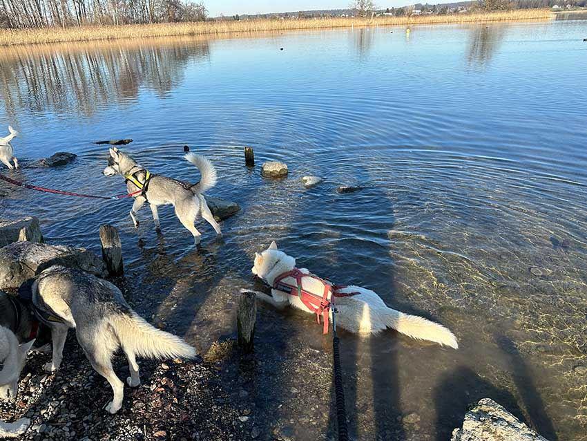 Wie immer, sind wir mit unseren Zughunden ziemlich schnell am marschieren, aber es macht allen Spass und die Hundis dürfen auch ab und zu ins Wasser.