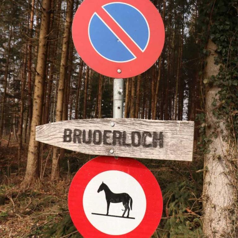In Schönholzerswilen startet der Geoweg, eine schöne Rungwanderung, mit einem Abstecher zum Bruderloch. Der Weg ist mehrheitlich flach und es gibt nur ein paar kurze etwas steilere Abschnitte. Das Bruderloch haben wir dann auch erreicht. Es ist eine 18 Meter lange Höhle, die vermutlich um das 5. Jahrhundert nach Christus entstand. Das Loch ist gerade so gross, dass man gebückt hineingehen kann.