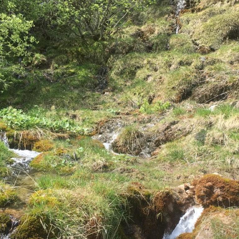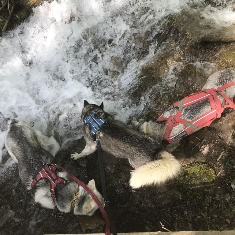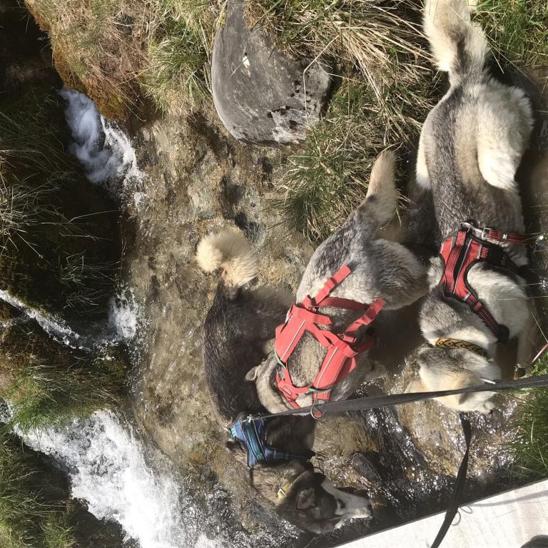 Obwohl es bereits Ende Mai ist, treffen wir auf dem Weg auch auf einige Schneefelder, welche sich aber gut durchqueren lassen. Die Hunde freuen sich natürlich, dass sie noch einmal Schnee unter ihren Pfoten haben. Weil es auch noch recht warm ist, sind wir alle froh, dass an vielen Stellen Wasser vom tauenden Schnee herunterläuft. So können sich unsere Vierbeiner immer wieder erfrischen.