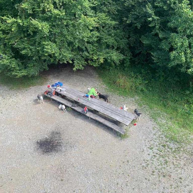Hier beim Turm grillieren wir über dem Feuer unsere Würste, stärken uns und geniessen die Ruhe und die Sonne, die sich jetzt doch noch zeigt. Auch die Hunde sind ruhig und entspannt. Nach der Mittagspause wandern wir wieder zurück, durch den Wildtierpark Bruderhaus zum Ausgangspunkt beim Bahnhof in Sennhof.