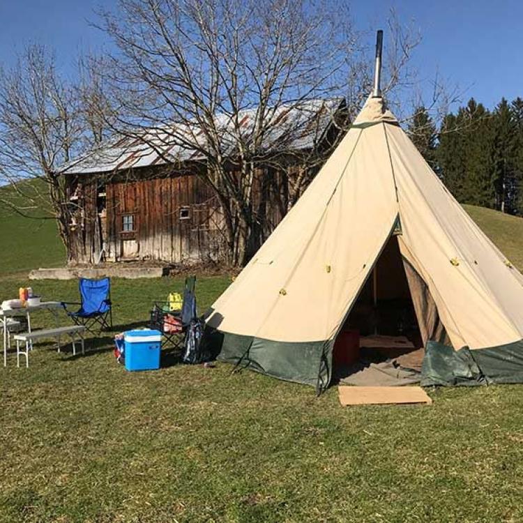 Gegen Abend sind wir wieder an unserem Zelt angekommen und sind froh, dass wir uns jetzt etwas erholen können. Wir geniessen die frühlingshaften Sonnenstrahlen und die schöne Aussicht auf den Säntis. Zum Nachtessen grillieren wir Würste und Fleisch auf dem Feuer. Dann sind wir aber doch froh, dass wir im Zelt noch einen Ofen haben, denn in der Nacht wird es doch noch recht kalt hier oben. Aber zum Glück haben wir warme Schlafsäcke, wo wir uns einkuscheln und so eine erholsame Nacht verbringen werden.