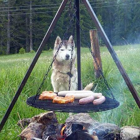 Der Abend Am Abend wird sogar das Wetter etwas besser und wir entschliessen uns, das mitgebrachte Fleisch draussen an der Feuerstelle zuzubereiten. Geschmeckt hat uns das reichhaltige Abendessen und die Hunde haben es auch genossen. Die bekamen natürlich vorher auch noch ihr wohlverdientes Fressen. Für die Hunde gibt es extra einen trockenen Bereich in der Hütte. Aber offenbar sind sie hier nicht besonders glücklich, darum dürfen sie die Nacht draussen verbringen, wie es sich für einen Schhlittenhund gehört. Auch wir schlüpfen bald in unsere Schlafsäcke, allerdings im Trockenen. Wir wollen ja am nächsten Morgen wieder fit sein und hoffen auf besseres Wetter.