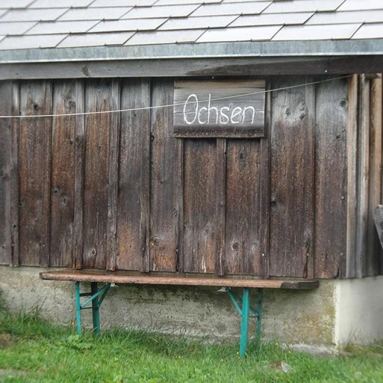 Auf der Alphütte gibt es feine "Chäshörnli" und Wüstchen dazu. Hier können wir gut unsere nassen Kleider trocknen, denn hier ist es warm und die Hütte ist trotz dem nassen Wetter voll mit Leuten.