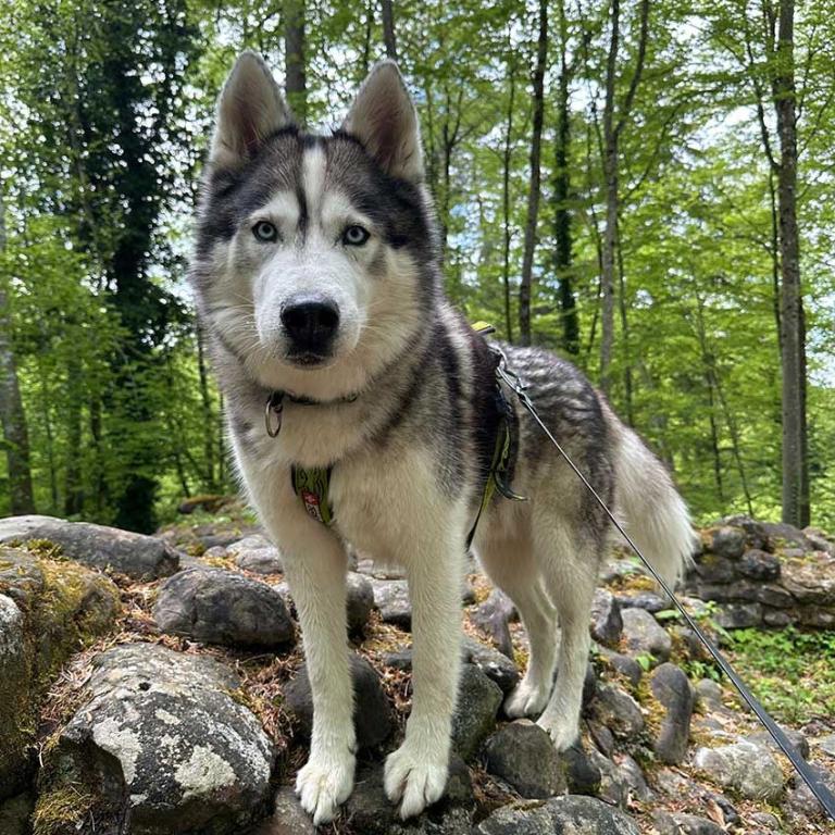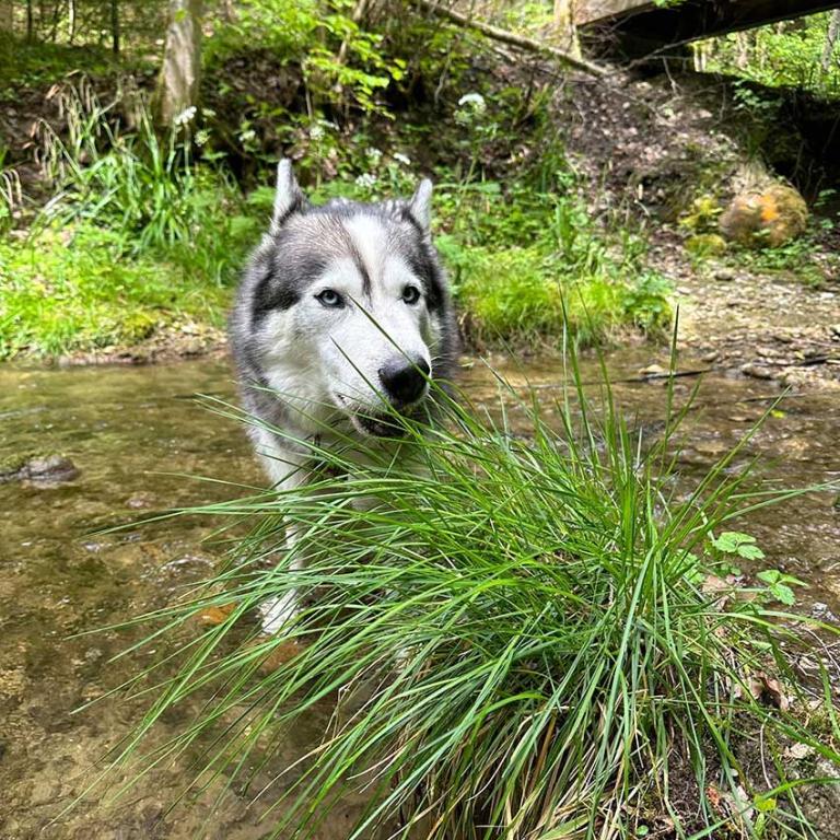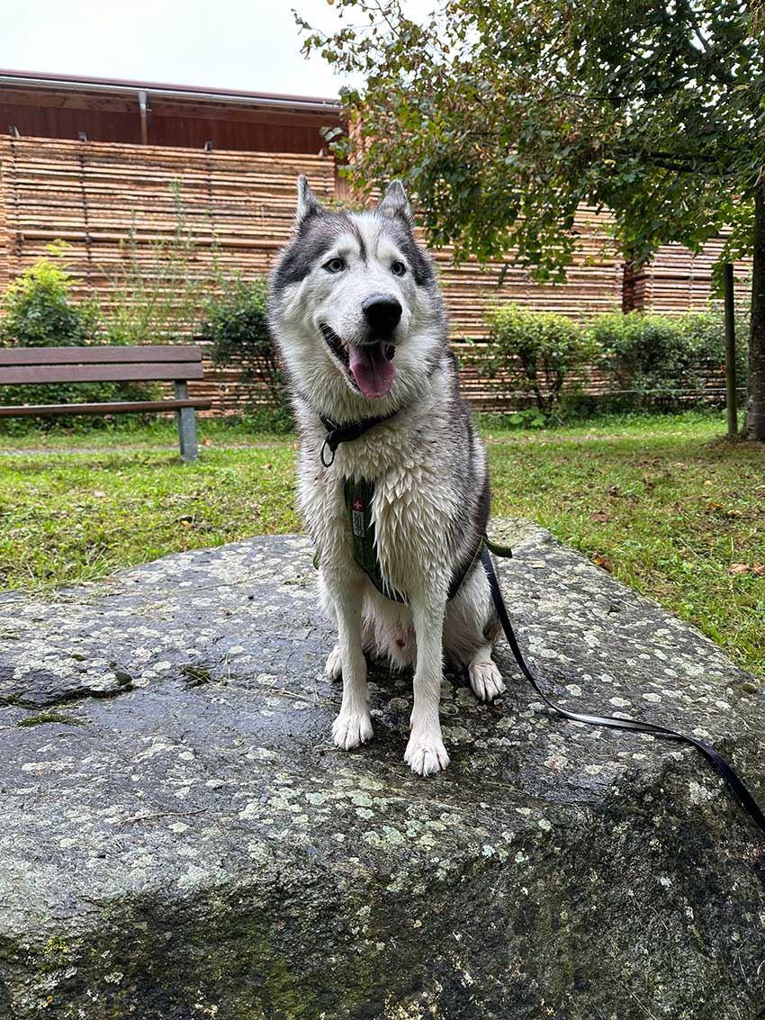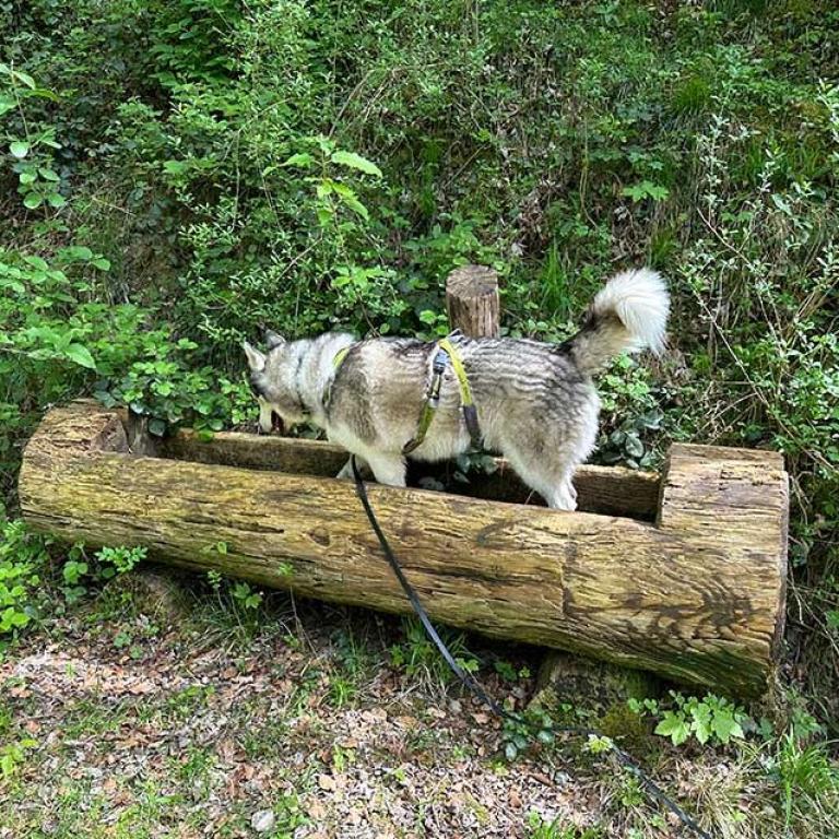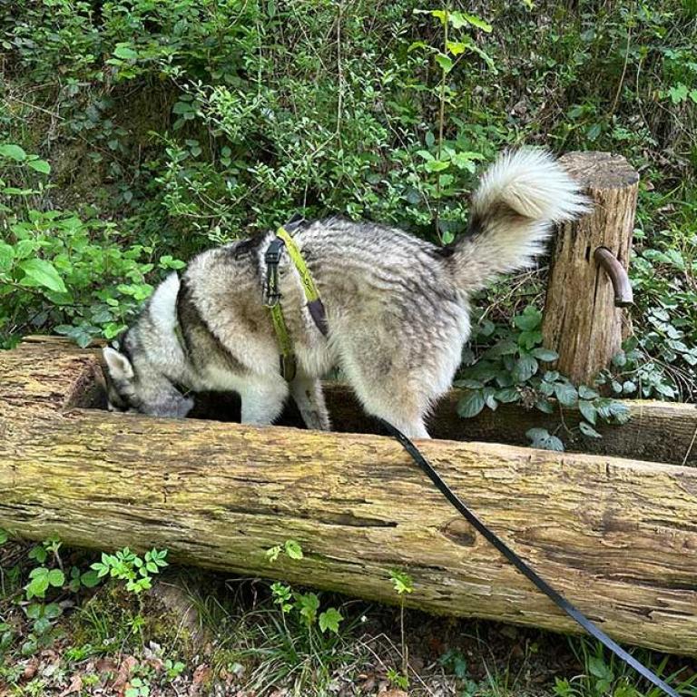 Natürlich mach auch das baden im Brunnen Spass. Arlo liebt das Wasser und die Spaziergänge durch den Wald. Auch erschnüffelt er gerne Tierspuren und würde diese dann gerne verfolgen.