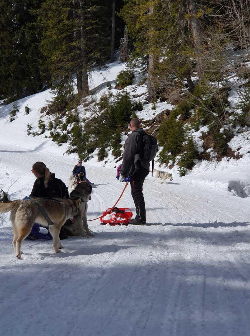 Einem Schlittenhund ist es eigentlich egal, was er zieht, es muss nicht immer ein Rennschlitten sein. Ein planierter Winterweg eignet sich gut, um mit dem Hund und einem "normalem" Plastik- oder Holz Schlitten den Berg hoch zu laufen, um dann anschliessend eine rasante Abfahrt zu geniessen. Dabei muss man allerdings unbedingt darauf achten, dass man nicht mit dem Schlitten in den Hund fährt, sonst könnte dieser dies als negative Erfahrung aufnehmen und ist dann vielleicht nicht mehr motiviert, vor dem Schlitten den Berg runter zu rennen. Vor allem, wenn der Schnee hart oder sogar vereist ist, kann es schnell einmal Probleme mit dem bremsen geben. Ab besten benutzt man dazu die Füsse. Und natürlich muss man dabei auch auf entgegenkommende Personen achten. Die meisten Hunde haben Spass, wenn sie einfach mal vor dem Schlitten vorausrennen dürfen. Aber wie gesagt, man muss den Schlitten immer unter Kontrolle haben und dabei die Geschwindigkeit, die von den Hunden bestimmt wird, richtig einschätzen, sonst kann der Spass für Hund und Mensch schnell vorbei sein.