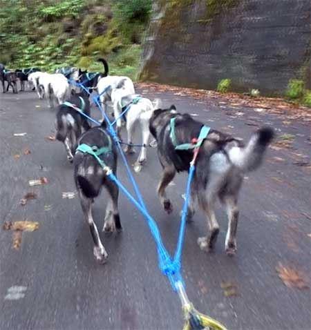 Weiter oben wird noch ein paar mal das Wenden geübt. Eine 180 Grad Kurve ist nämlich für die Hunde und auch für den Musher eine grosse Herausforderung. Wenn dann noch, wie bei uns, mehrere Teams hintereinander fahren, dann müssen die Hunde lernen, bei den anderen Artgenossen vorbeizugehen, ohne sie freundlich oder unfreundlich zu begrüssen.