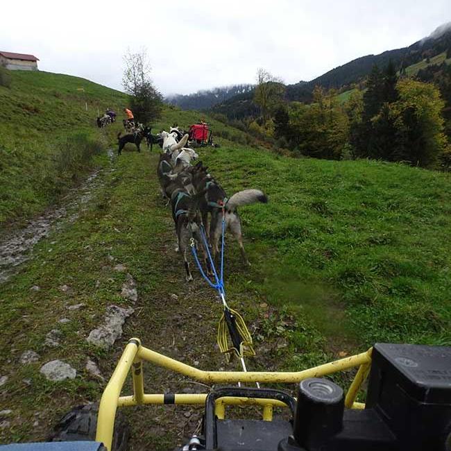 Heute ist es zwar Nass, aber es regnet nur wenig, hier im schönen Toggenburg. Nachdem wir die Hunde begrüsst haben, werden unsere Teams zusammengestellt, welche aus 5 bis 12 Hunden bestehen. Gefahren wird auf eine Quad, oder auf einem Wagen.