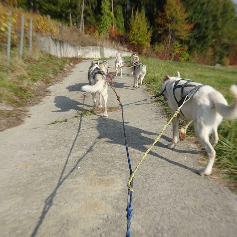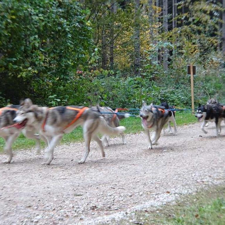 Am Abend haben wir noch Zeit, die Rennstrecke (11 km) mit unseren 6 Hunden abzufahren. Die Strecke ist sehr abwechslungsreich mit engen Kurven, anstrengendem Aufstieg und rassanter Abfahrt. Die Rennstrecken sind 5 und 11 km lang.
