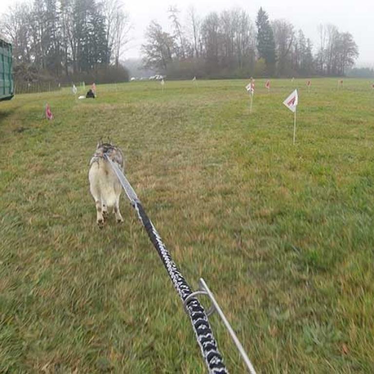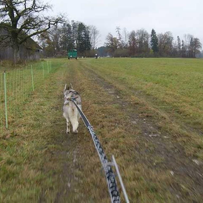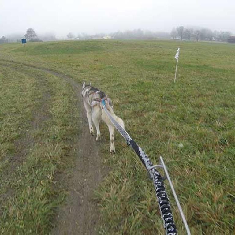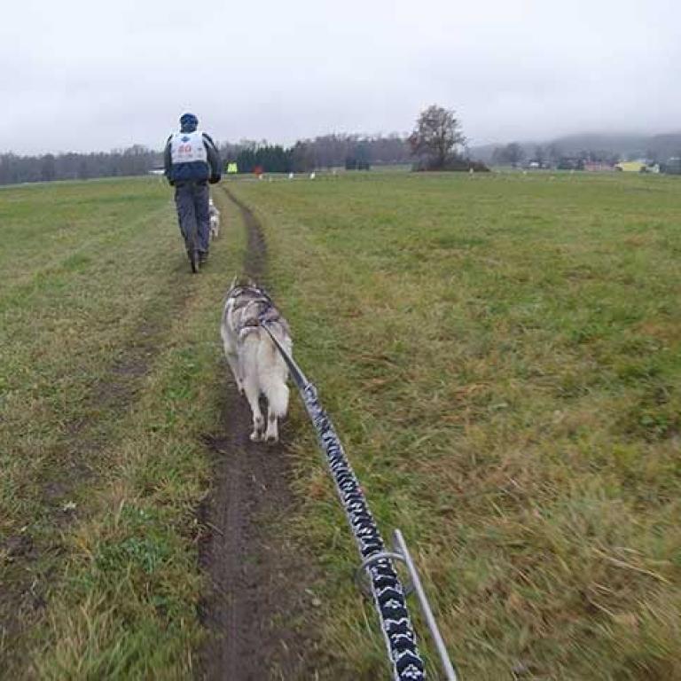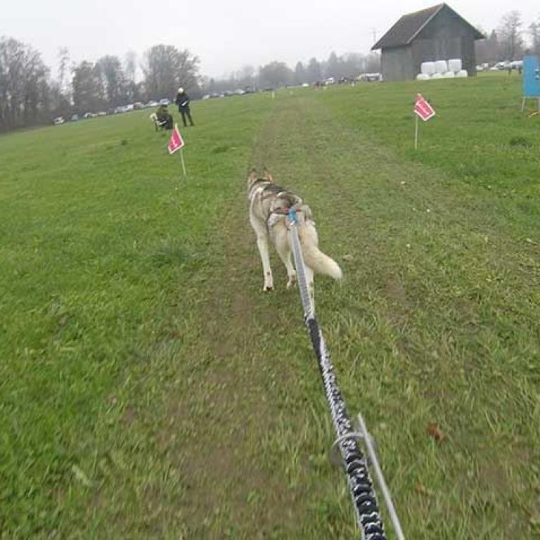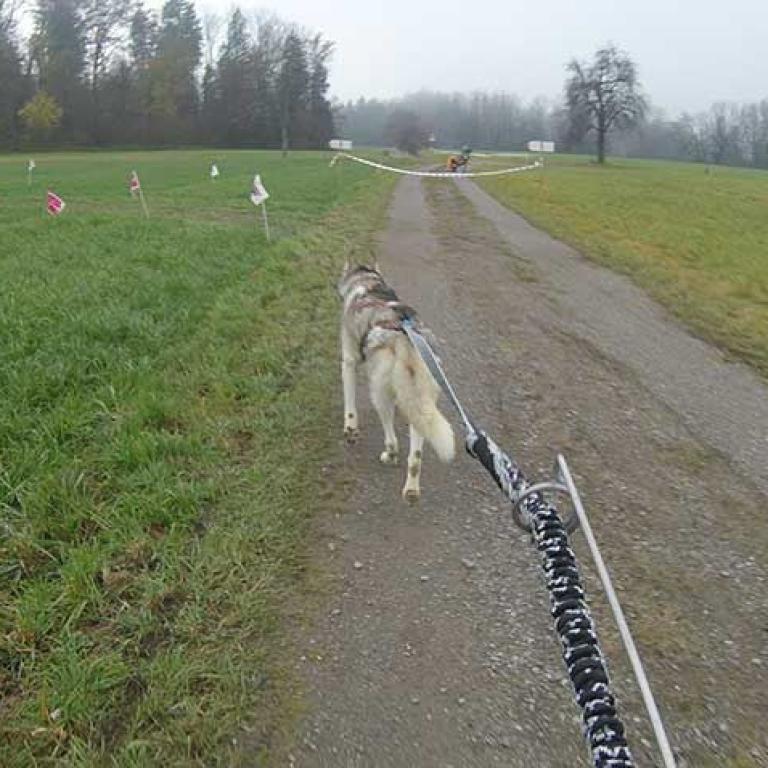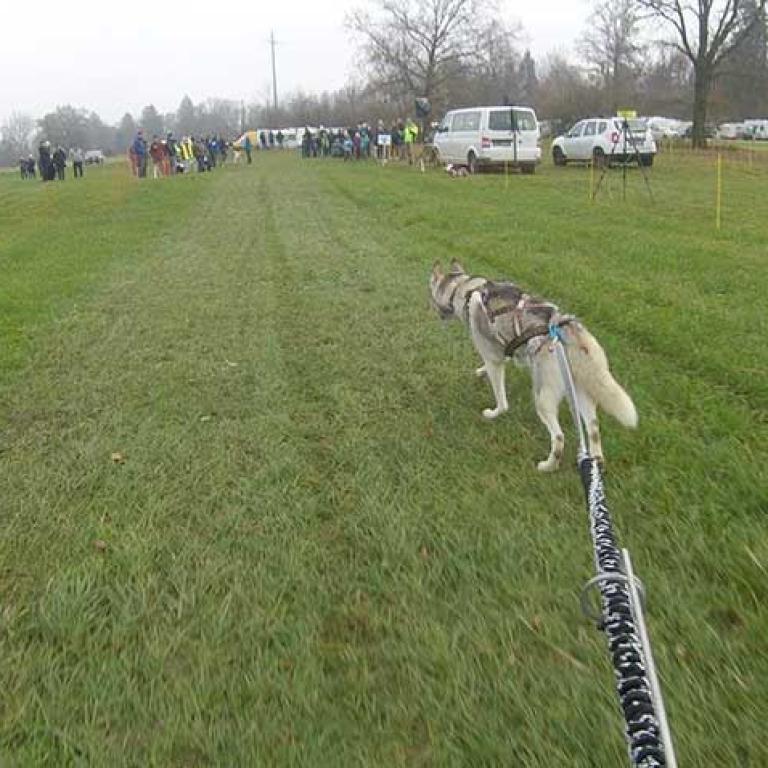Die Strecke ist sehr schön und abwechslungsreich angelegt. Es geht über Kieswege, geteerte Strassen und am Schluss noch über eine Wiese, was natürlich noch einmal einen besonderen Krafteinsatz von Hund und Musher fordert. Aber wir sind glücklich am Ziel angekommen und freuen uns schon auf den zweiten Lauf am Sonntag.