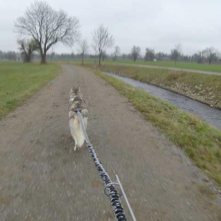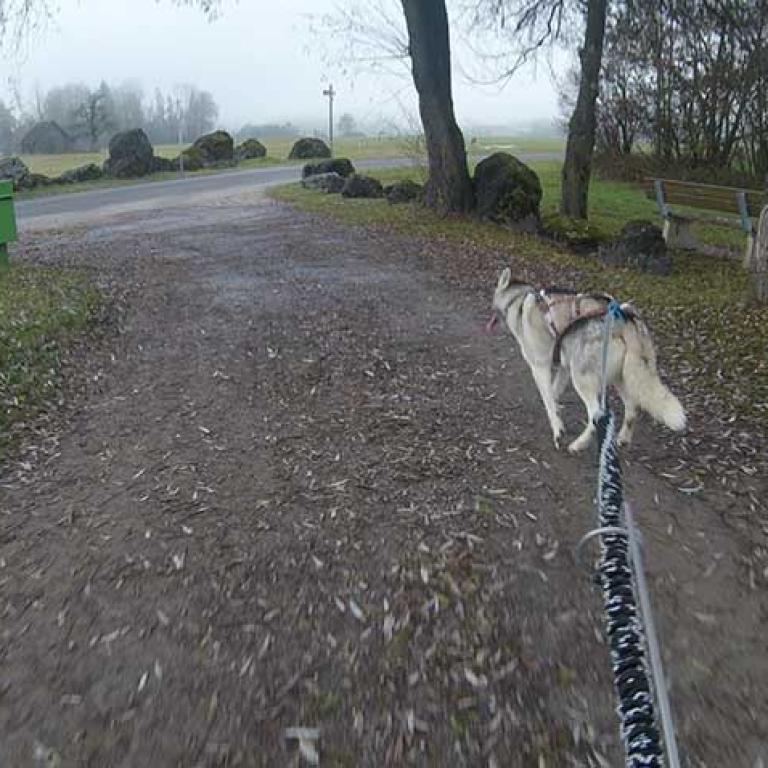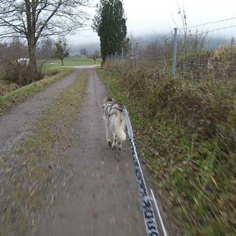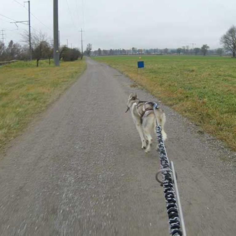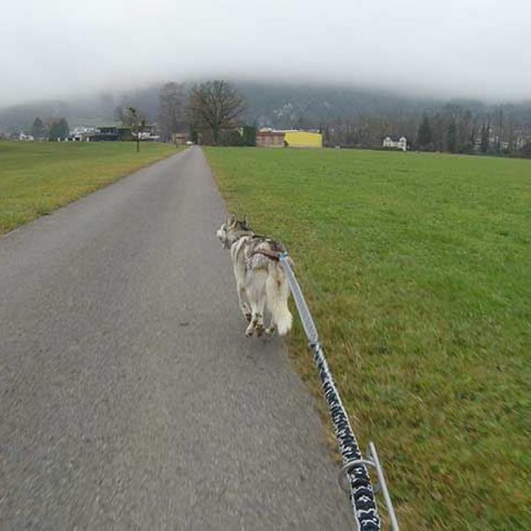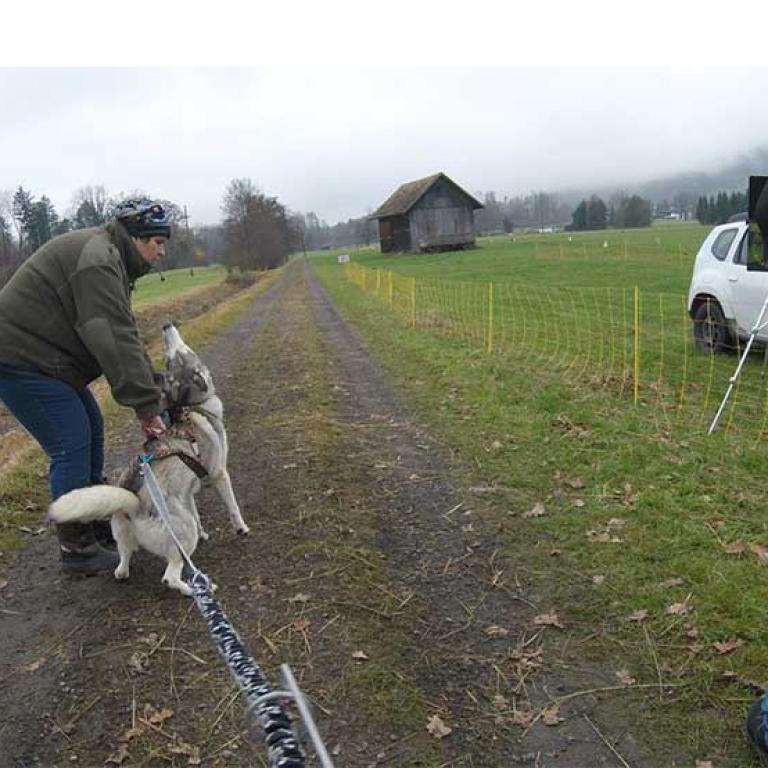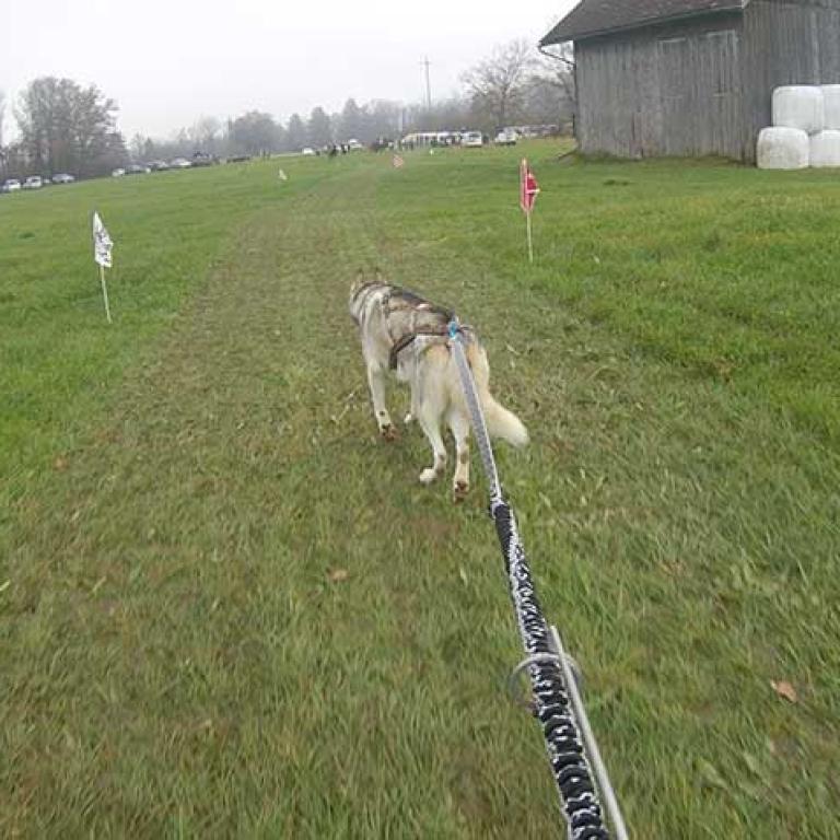 Die Strecke ist sehr schön und abwechslungsreich angelegt. Es geht über Kieswege, geteerte Strassen und am Schluss noch über eine Wiese, was natürlich noch einmal einen besonderen Krafteinsatz von Hund und Musher fordert. Aber wir sind glücklich am Ziel angekommen und freuen uns schon auf den zweiten Lauf am Sonntag.