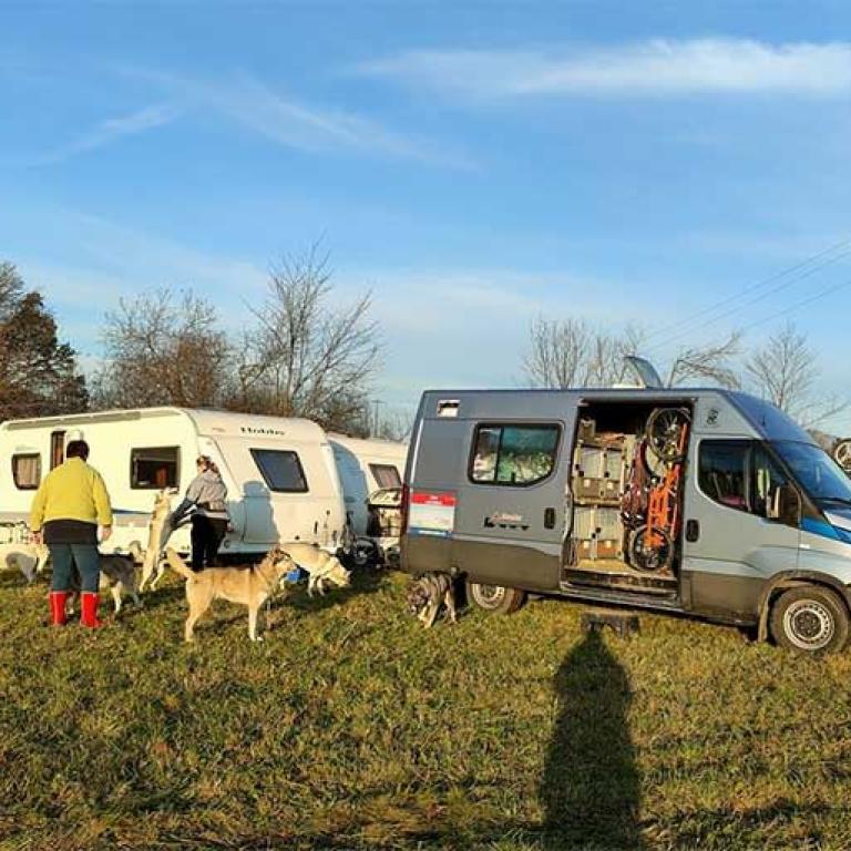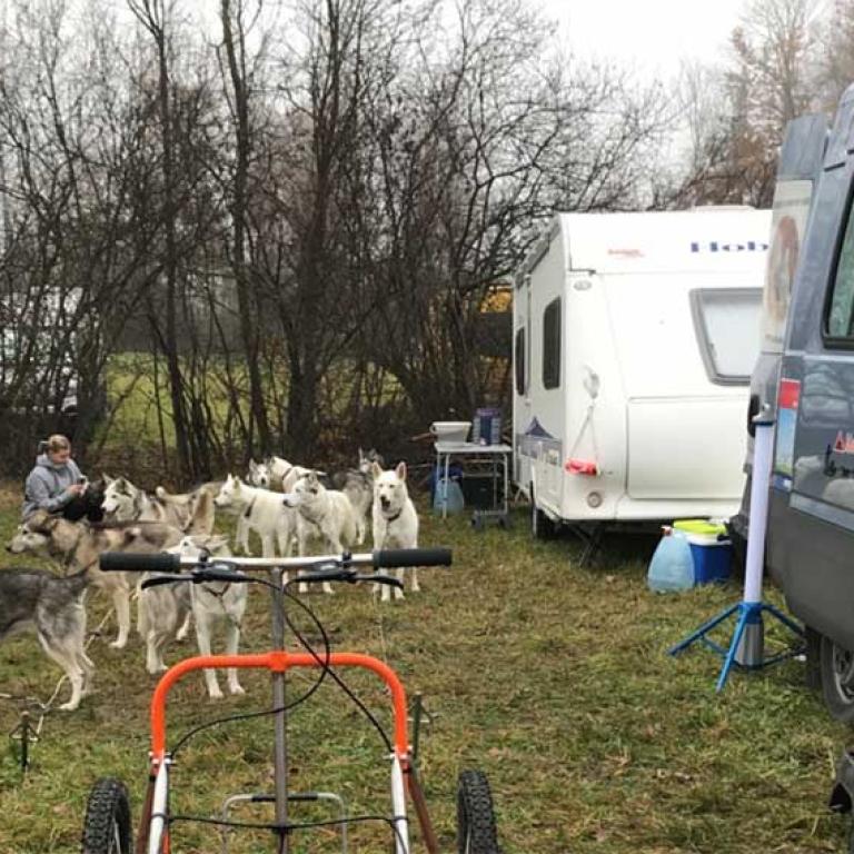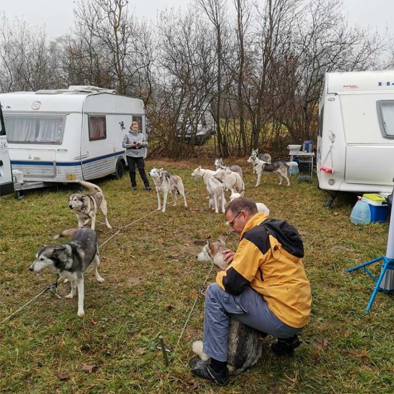 Ich starte aber erst am Nachmittag mit meinem Patenhund Inuik, so habe ich noch genügend Zeit, mich vorzubereiten. Bei so einem Anlass gibt es immer viel zu tun, schliesslich müssen auch die Hunde versorgt werden. Diese schlafen in der Box, nur der kleine, 6 Monat junge Ivor darf bei uns im Wohnwagen schlafen.