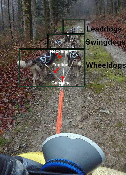 Gleich hinter dem Schlitten spannt man zwei Hunde ein, die stark sind und immer gut mitziehen. Diese nennt man "Wheeldogs". Je nach Teamgrösse werden dann zwei oder mehrere sogenannte "Swingdogs" eingespannt. Diese helfen beim steuern des Schlittens oder Wagen mit. Ganz vorn befinden sich dann die Leithunde (Leader). Diese müssen auf die Befehle des Mushers hören und führen alle anderen Hunde an. Ein guter Leader ist für einen Musher besonders wertvoll.